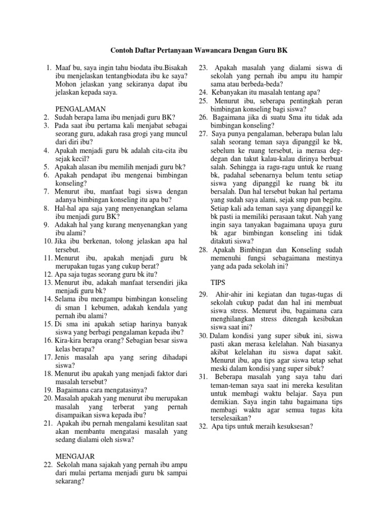 Contoh Daftar Pertanyaan Wawancara Dengan Guru Bk